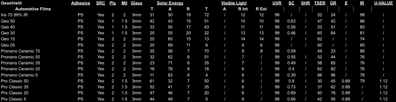 Geoshield Pronano Ceramic Automotive film is revolutionizing the window film business. Pronano is a next generation automotive film that fuses color stable polyester with nano ceramic particles. This hybrid combination delivers outstanding infrared heat rejection and uncompromising looks. The 2mil film is the most installer friendly film on the market. Its aggressive adhesive and shrink ability make it super easy to install.